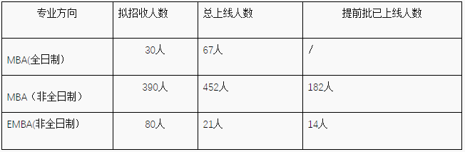 3、滿(mǎn)足EMBA報(bào)考條件,初試成績(jī)同時(shí)符合第一志愿專(zhuān)業(yè)的學(xué)校復(fù)試分?jǐn)?shù)線(xiàn)和國(guó)家A類(lèi)分?jǐn)?shù)線(xiàn)的公共管理、會(huì)計(jì)專(zhuān)業(yè)的考生可申請(qǐng)調(diào)劑至EMBA(非全日制)