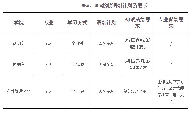 根據(jù)我校2019年碩士研究生一志愿生源情況,MBA、MPA專業(yè)學(xué)位可以接收部分生源調(diào)劑。