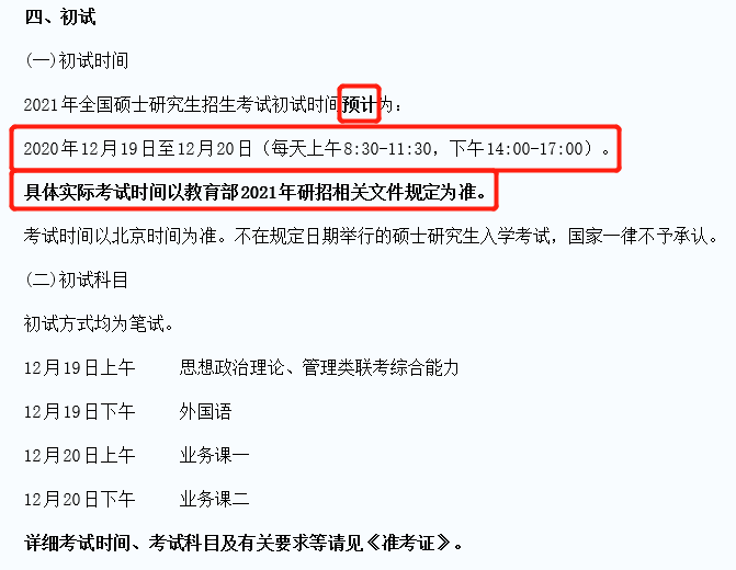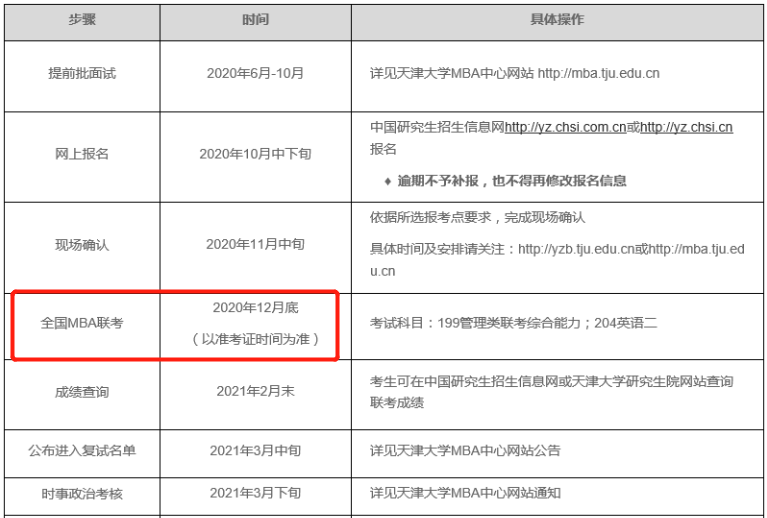 受疫情影響,今年管理類聯(lián)考的時(shí)間尚未確定,已經(jīng)公布2021年MBA招生簡(jiǎn)章的院校對(duì)于管理類聯(lián)考初試時(shí)間部分都是12月底(以準(zhǔn)考證時(shí)間為準(zhǔn)),尚未明確具體時(shí)間,例如天津大學(xué):