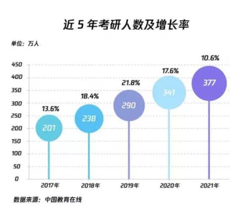 近年來,考研形式越發(fā)嚴酷,2021年考研報名人數(shù)繼續(xù)上漲,達到377萬,較2020年的341萬增加36萬,增幅為10.6%,報考人數(shù)再創(chuàng)歷史新高。自2017年研究生報考人數(shù)首次突破200萬人大關(guān),達到201萬后,考研人數(shù)逐年上漲,五年翻了近一番,考研的壓力和難度可想而知。