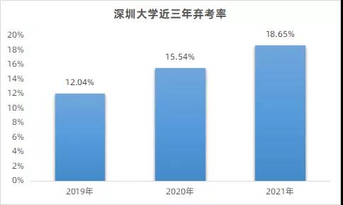 具體到院校,以深圳大學(xué)為例。2019年共有16019準(zhǔn)考考生,實(shí)考14090人,實(shí)考棄考率為12.04%;2020年共有22689名準(zhǔn)考考生,實(shí)考19162人,實(shí)考棄考率為15.54%;2021年共有19726名準(zhǔn)考考生,實(shí)考16047,實(shí)考棄考率為18.65%。