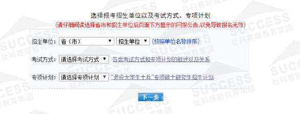 6.選擇報考單位:有三個選項(xiàng),招生單位第一欄選擇所報院校所在地,第二欄選擇自己所報院校;考試方式務(wù)必選擇管理類聯(lián)考,專項(xiàng)計(jì)劃選擇無,填寫完畢以后選擇下一步。