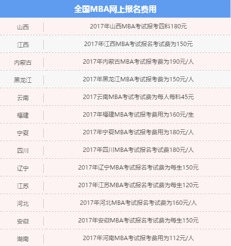 以2017年各地區(qū)MBA報名費(fèi)用為例,具體如下: