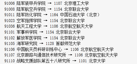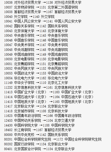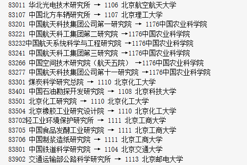 1105北京工業(yè)大學(xué)、1107北京理工大學(xué)、1108北京科技大學(xué)、1110北京化工大學(xué)、1133中國(guó)傳媒大學(xué)、1153中國(guó)政法大學(xué)、1154 北京聯(lián)合大學(xué)、1166 中國(guó)青年政治學(xué)院。
