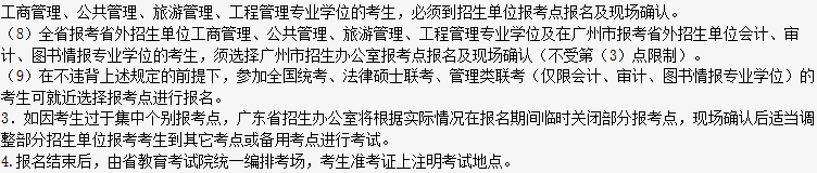單獨(dú)考試及工商管理、公共管理、旅游管理和工程管理等專業(yè)學(xué)位的考生應(yīng)選擇招生單位所在地省級(jí)教育招生考試管理機(jī)構(gòu)指定的報(bào)考點(diǎn)辦理網(wǎng)上報(bào)名和現(xiàn)場(chǎng)確認(rèn)手續(xù);