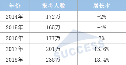 導讀:我國碩士研究生報名人數(shù)整體呈上升趨勢,2014年起連續(xù)兩年下跌,到2016年止跌回升,2018年報考人數(shù)達到238萬,報名增長率達到18 4%。