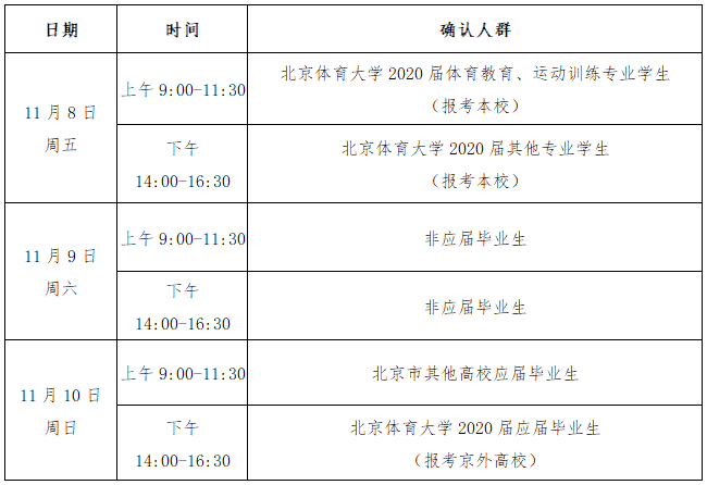 在2020年全國碩士研究生招生考試網(wǎng)報中,報考點選擇北京體育大學(考點代碼1143),且網(wǎng)上交費成功的考生,須在本考點參加現(xiàn)場確認。請考生務必認真閱讀本公告,并按公告要求提供現(xiàn)場確認相關報考材料,未按要求提供的,不予確認,報名無效?,F(xiàn)場確認時須由考生本人辦理,不得由他人代辦。