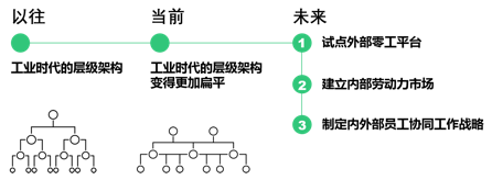 與傳統(tǒng)企業(yè)自工業(yè)時(shí)代以來(lái)一直依賴的陳舊等級(jí)管理模式相比,數(shù)字領(lǐng)軍企業(yè)能夠輕松利用技術(shù)更迅速地彌合人才缺口、啟動(dòng)新項(xiàng)目,并能更加及時(shí)地應(yīng)對(duì)市場(chǎng)變化。對(duì)于大型傳統(tǒng)企業(yè)來(lái)說(shuō),嘗試使用新興柔性勞動(dòng)力派遣平臺(tái),無(wú)需即刻就對(duì)現(xiàn)有管理模式作出重大調(diào)整,卻可以隨著時(shí)間的推移逐步發(fā)揮“鲇魚(yú)效應(yīng)”,通過(guò)柔性團(tuán)隊(duì)的使用來(lái)推動(dòng)革新、積累技能、建立人才檔案。自然而然地,借助外部力量,企業(yè)內(nèi)部員工團(tuán)隊(duì)也將從按崗招聘、業(yè)務(wù)職能固化的傳統(tǒng)用工方式中脫離出來(lái),實(shí)現(xiàn)更多自我價(jià)值,也為企業(yè)創(chuàng)造更多價(jià)值。