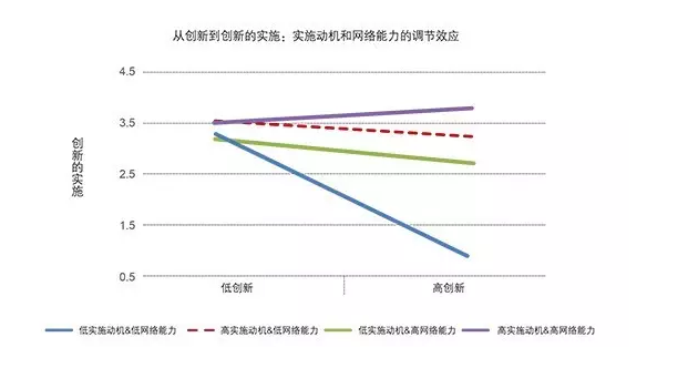 該研究發(fā)現(xiàn),創(chuàng)新的想法并不總能得到實(shí)施,創(chuàng)新與創(chuàng)新的實(shí)施之間的關(guān)系受個(gè)人將其想法予以實(shí)施的動(dòng)機(jī)及社會(huì)網(wǎng)絡(luò)能力(或強(qiáng)關(guān)系)的調(diào)節(jié)。具體而言,當(dāng)個(gè)人實(shí)施創(chuàng)新的動(dòng)機(jī)及網(wǎng)絡(luò)能力(或強(qiáng)關(guān)系)都較低時(shí),個(gè)人的創(chuàng)新與其創(chuàng)新的實(shí)施高度負(fù)相關(guān);而在其他情況下,較高的個(gè)人實(shí)施創(chuàng)新的動(dòng)機(jī)或較高的網(wǎng)絡(luò)能力(或強(qiáng)關(guān)系)能“緩沖”創(chuàng)新對(duì)其實(shí)施的負(fù)面影響(見(jiàn)圖)。