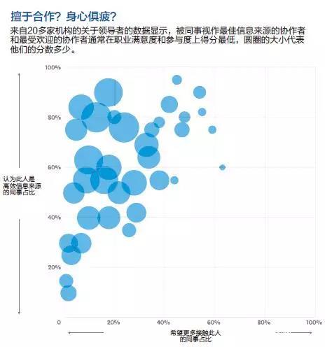 圖表數(shù)據(jù)來自20家樣本機構(gòu)中業(yè)務(wù)部門的直線管理者。表格中上部和右側(cè)的人是公司中的最佳信息來源,也是收到協(xié)作請求最多的人。他們的參與度和職業(yè)滿意度得分最低,得分由圓圈大小表示。