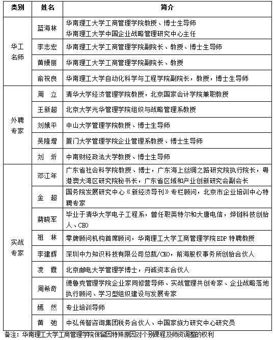 本課程旨在為企業(yè)發(fā)展提供智力支持,發(fā)揮華南理工大學(xué)工科優(yōu)勢,貫徹“名校+名企”戰(zhàn)略。以資深師資團隊為核心,以華南本土企業(yè)資源為依托,以構(gòu)建人才培養(yǎng)生態(tài)鏈為宗旨,致力于培養(yǎng)具有戰(zhàn)略眼光和現(xiàn)代企業(yè)系統(tǒng)管理知識,具有創(chuàng)新精神和全球視野,引領(lǐng)產(chǎn)業(yè)發(fā)展的精英企業(yè)家和高層管理人員。