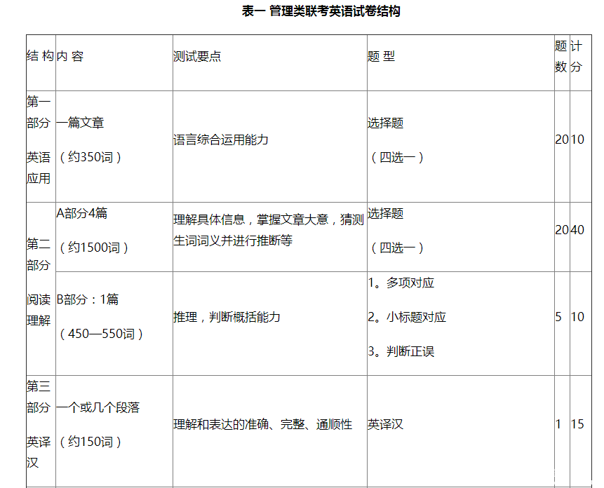 考試內(nèi)容包括商務(wù)英語閱讀、邏輯數(shù)學(xué)推理、管理案例分析和商業(yè)判斷能力四大部分。其中: