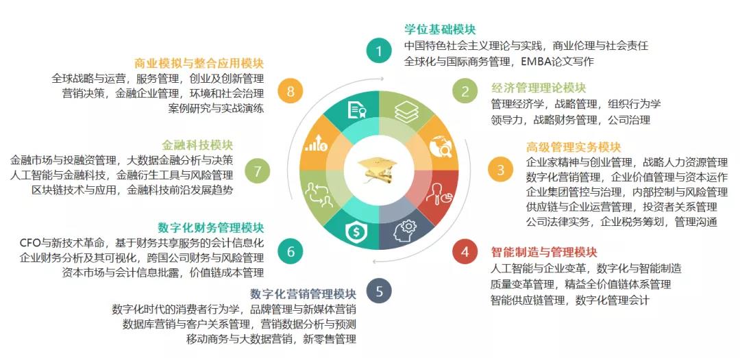 1.學位基礎模塊:主要培養(yǎng)EMBA研究生擁有堅定正確的政治方向、國際化商業(yè)視野及社會責任感,成為能夠肩負中華民族偉大復興重任的經(jīng)營管理者。