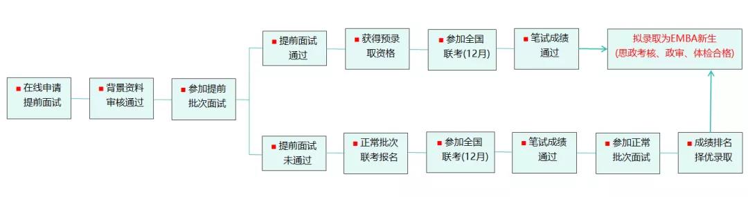 未參加提前批面試或未獲得EMBA預錄取資格的考生,聯(lián)考成績達到天津財經(jīng)大學EMBA錄取分數(shù)線可申請參加正常批次復試,按筆試和復試(面試)總成績排名,擇優(yōu)錄?。ㄙY格審查、思想政治考試、體檢和政審等合格)。