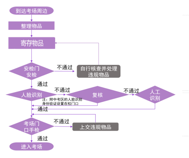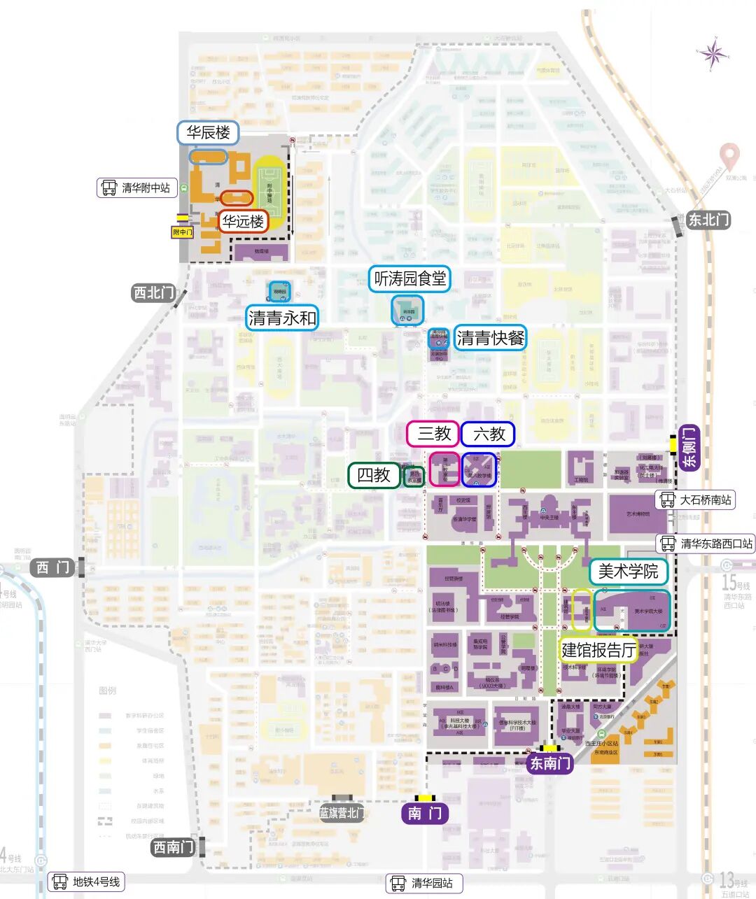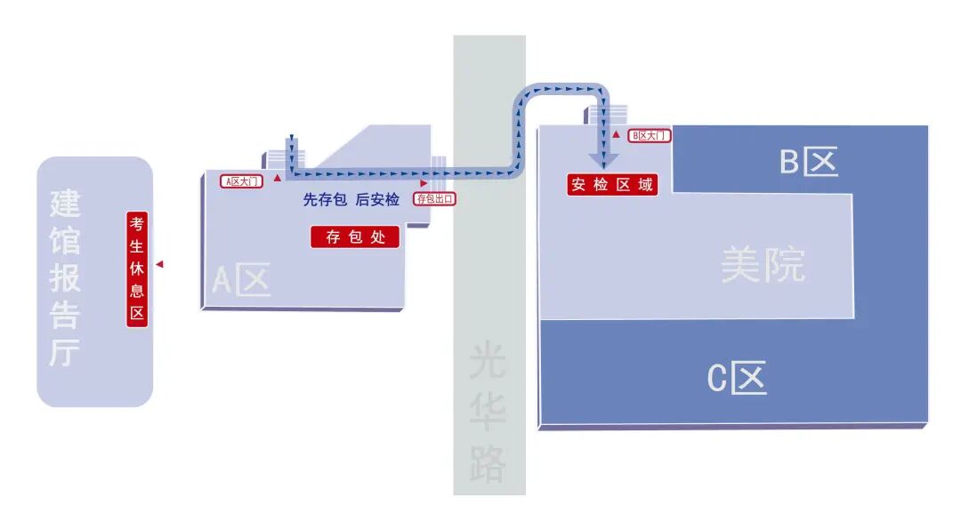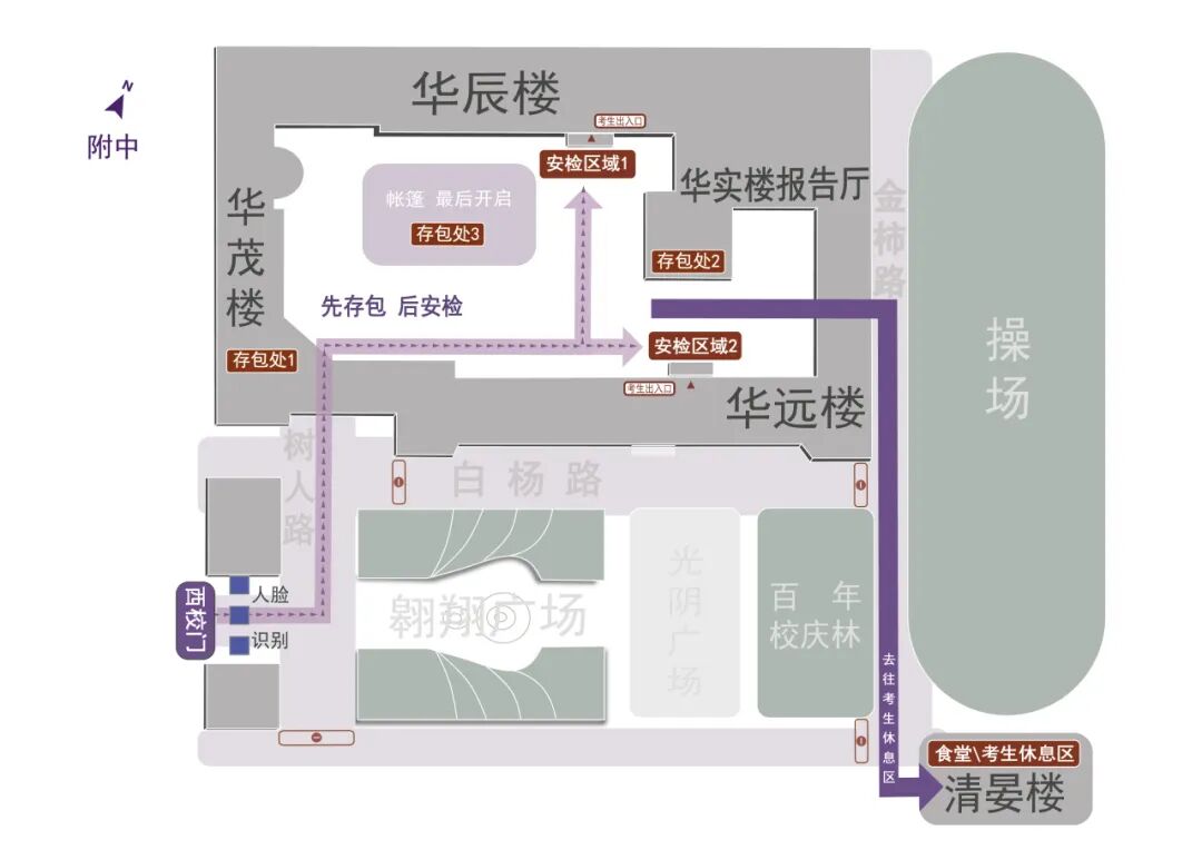 2026年全國碩士研究生招生考試 清華大學(xué)考點考生須知 清華經(jīng)管EMBA2026級研究生統(tǒng)考筆試 將于2025年12月20日上午舉行 為確??荚囘^程平穩(wěn)順利 清華大學(xué)考點現(xiàn)就 考前材料準(zhǔn)備、入場安排、考場分布 就餐和休息等相關(guān)事宜 公告如下 01 考前材料準(zhǔn)備 身份證:本人有效期內(nèi)居民身份證原件。 準(zhǔn)考證:憑網(wǎng)報用戶名和密碼登錄“中國研究生招生信息網(wǎng)” (https://yz.chsi.com.cn)下載打印,正反面不得涂改和書寫。 符合規(guī)定的考試用品:比如2B鉛筆、黑色字跡的鋼筆或簽字筆、直尺、圓規(guī)、三角板、無封套橡皮等必需的考試用品,或者按照招生單位在準(zhǔn)考證上注明的所需攜帶的用具。 A4尺寸透明文件袋:將上述材料提前裝入透明文件袋。 02入場安排 1入場地點(見圖1) ①考試地點在清華大學(xué)校內(nèi)四教、六教、美術(shù)學(xué)院的考生:學(xué)校的各個門均可入校和出校,其中東南門、東側(cè)門和南門距離考場相對較近(步行約20分鐘)。清華大學(xué)東南門臨近雙清路和華業(yè)大廈,東側(cè)門臨近荷清路和清華大學(xué)藝術(shù)博物館,南門臨近中關(guān)村東路和文津酒店。 ②考試地點在清華附中的考生:唯一入校和出校通道——清華附中西校門(地址為北京市海淀區(qū)中關(guān)村大街清華大學(xué)北側(cè),西校門臨近中關(guān)村北大街和清華附中公交站)。 圖1 清華校內(nèi)和附中的考場分布圖 2入場時間 按照要求今年研考入場安檢實行智能安檢、人臉識別、金屬探測等核查方式,考生入校后須提前在考場安檢區(qū)外的存包處存放個人物品。考慮到存包及入場查驗需要、考生入校后距離考場樓較遠(yuǎn),請考生預(yù)留充足時間。入校后只能步行或騎車,請根據(jù)現(xiàn)場工作人員的指揮停放自行車。 ①考試地點在清華大學(xué)校內(nèi)四教、六教、美術(shù)學(xué)院的考生:各校門開放時間均為6:00—24:00。 ②考試地點在清華附中的考生:附中西校門開放時間為早6:50,下午12:15。 3入場流程 考生進入考點時,須使用有效身份證在身份智能認(rèn)證系統(tǒng)驗證通過后即可進入。如系統(tǒng)驗證失敗,則須通過人工核查有效身份證及準(zhǔn)考證,合格后方可進入。無法確認(rèn)身份的考生,考試當(dāng)天不得進入。 考生須先存包、后安檢,請考生到考場樓宇附近存包區(qū)就近存包,存包完成后請領(lǐng)取存包憑條,請考生妥善保存好存包憑條。 考生應(yīng)提前將本人準(zhǔn)考證、居民身份證等有效證件以及符合規(guī)定的考試用品一并裝入透明文件袋后,手持文件袋通過智能安檢門。 ①考生將考試用品以外的個人物品存放在存包處(已在下面的考場分布圖中標(biāo)識)。建議考生提前準(zhǔn)備兩份準(zhǔn)考證,一份帶入考場,一份放置在寄存包內(nèi)。以便在存包憑條不慎遺失的特殊情況下,待存取包高峰期過后,憑準(zhǔn)考證和身份證核實身份后方可領(lǐng)取寄存物品。 ②考生在現(xiàn)場工作人員引導(dǎo)下有序通過智能安檢門,完成人臉識別校驗及手持金屬探測儀核查后進入考場,避免混亂、擁擠。嚴(yán)禁考生攜帶各類電子通訊工具(如手機、智能手表、智能手環(huán)、智能眼鏡、無線耳機等智能穿戴設(shè)備)等物品進入考場。建議考生在考試當(dāng)天不攜帶電子通訊工具,不攜帶鑰匙、磁卡、打火機、金屬手鐲、戒指、項鏈等物品,不穿戴有金屬裝飾品的衣服、鞋帽、發(fā)卡等,避免反復(fù)安檢,影響正常入場考試。 存包和安檢的具體流程如圖2所示。 圖2 存包、安檢流程圖 對于因身體特殊情況(如安裝有心臟起搏器、金屬牙具,使用助聽器,孕婦等)無法使用安檢設(shè)備進行檢查的考生,請于12月17日17:00之前將醫(yī)療機構(gòu)出具的證明文件掃描件(文件名稱須為姓名+1103開頭的9位報名號)及相關(guān)情況說明等發(fā)送至清華大學(xué)研招辦郵箱:yjszb@mail.tsinghua.edu.cn。并在安檢時主動向特殊安檢通道的工作人員說明,由專人檢查后進入考場。 考試期間,每天早晨6:50開始存放個人物品,7:30開始安檢;每天中午12:30開始存放個人物品,13:00開始安檢。 入校后,請直接前往考場樓附近的存包處存包,不要在其他區(qū)域活動或逗留,以免錯過入場時間。開考15分鐘后,遲到考生不準(zhǔn)進入考場參加當(dāng)科考試,如因個人原因?qū)е氯雸鲅诱`由考生本人負(fù)責(zé)。 因行動不便等特殊情況確實需要人員陪同的考生,應(yīng)提前聯(lián)系我校,陪同人員參照校外人員的入校要求辦理入校審批手續(xù),陪同人員不得進入考試封閉管理區(qū)域。對于使用輪椅、拐杖、纏有綁帶或打有夾板等的考生,由我校工作人員協(xié)助其對輪椅、拐杖等器械進行安檢后進入考場。 03 考場分布 1考試地點在清華大學(xué)校內(nèi) 四教、六教、美術(shù)學(xué)院的考生 考場分布于清華大學(xué)校內(nèi)四教、六教、美術(shù)學(xué)院,考場樓的實景圖見圖3。 四教、六教的樓門開放時間均為上午7:30,下午13:00。存包處為三教三段,安檢通道和考場樓入口分別如圖4所示。 美術(shù)學(xué)院的樓門開放時間為上午7:30,下午13:00。存包處為美術(shù)學(xué)院A區(qū),安檢通道和考場樓入口分別如圖5所示。 圖5 美術(shù)學(xué)院的存包處、安檢通道和考場樓