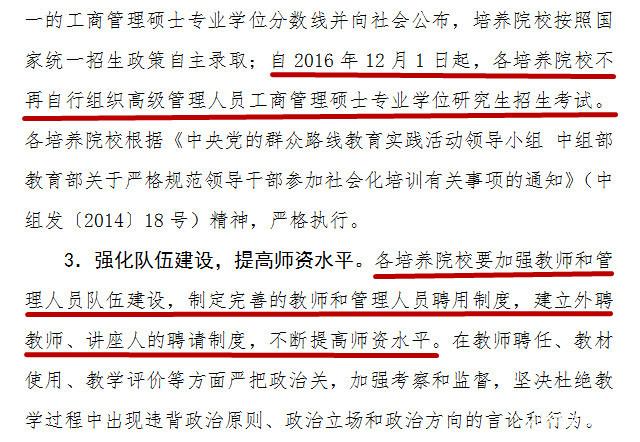 近日,教育部發(fā)布文件《教育部關(guān)于進(jìn)一步規(guī)范工商管理碩士專業(yè)學(xué)位研究生教育的意見》,文件稱2017年起,高級管理人員工商管理碩士(EMBA)將納入全國統(tǒng)一的碩士研究生入學(xué),由教育部統(tǒng)一劃線、各學(xué)校按需調(diào)整錄取。且從2016年12月1日開始,各院校不得再自行組織EMBA招生考試。