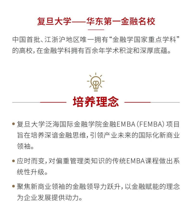 導(dǎo)讀:招生簡(jiǎn)章是每年考研er需要關(guān)注的重要官方政策,一般情況下涵蓋了各個(gè)專業(yè)的報(bào)考條件、招生名額、學(xué)費(fèi)、學(xué)制、報(bào)考流程等必要信息,為了幫助大家及時(shí)掌握一手信息,迅速做出報(bào)考應(yīng)對(duì),小編今天為大家?guī)砹恕?022EMBA招生簡(jiǎn)章:復(fù)旦大學(xué)泛海國(guó)際金融學(xué)院FEMBA項(xiàng)目2022級(jí)招生簡(jiǎn)章”,希望對(duì)報(bào)考MBA的同學(xué)有所幫助!