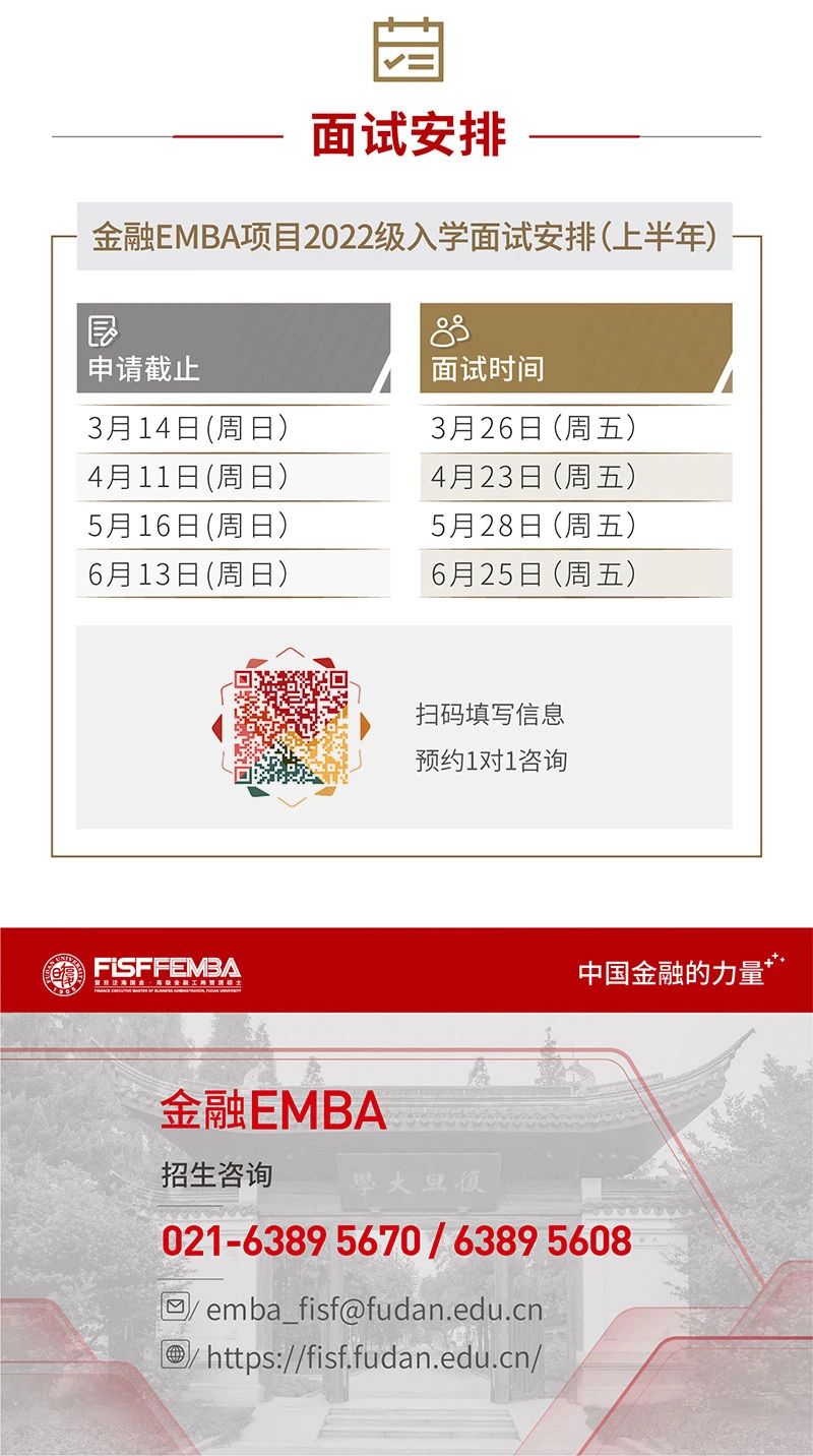 以上就是“2022EMBA招生簡(jiǎn)章:復(fù)旦大學(xué)泛海國(guó)際金融學(xué)院FEMBA項(xiàng)目2022級(jí)招生簡(jiǎn)章”全部?jī)?nèi)容了,更多MBA提前面試信息,請(qǐng)持續(xù)關(guān)注本網(wǎng)站。