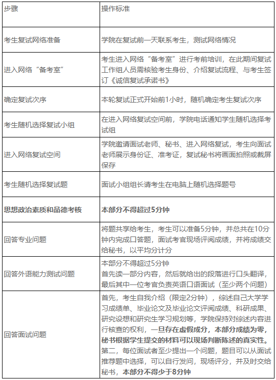 每個(gè)復(fù)試工作組由7人組成,其中:復(fù)試評(píng)委5人,1人為組長,1人負(fù)責(zé)英語提問;1人為專職網(wǎng)管老師(負(fù)責(zé)網(wǎng)絡(luò)技術(shù)處理,對(duì)考生圖像拍照或截屏),1人為專職秘書(負(fù)責(zé)通知候考學(xué)生,錄像,復(fù)試記錄,統(tǒng)計(jì)評(píng)分)。