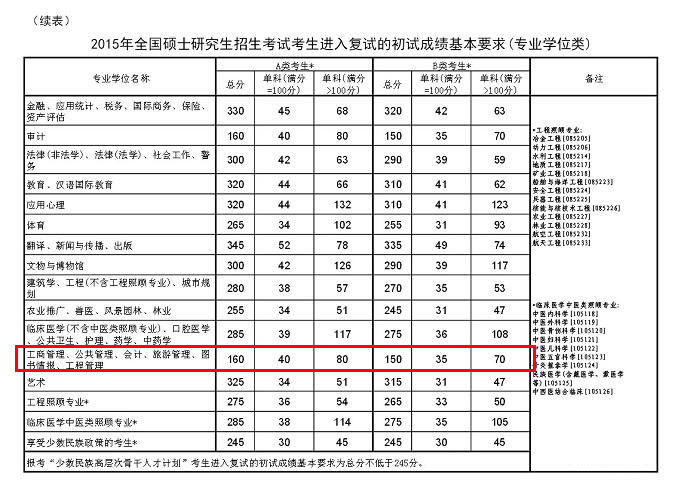 2015年工商管理碩士A類(lèi)院校總分為160分 B類(lèi)院??偡譃?50分,詳情請(qǐng)見(jiàn)下表