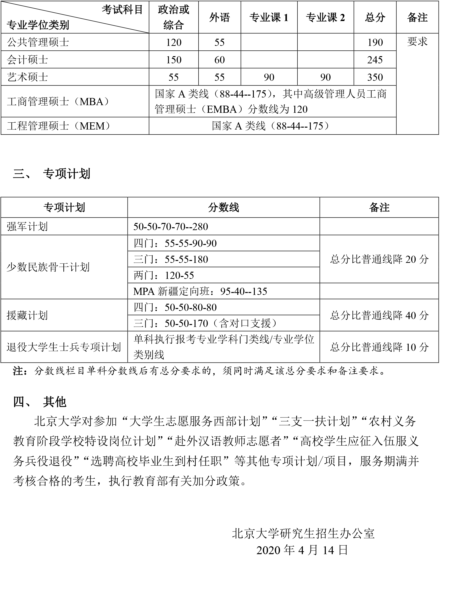 繼2020考研國(guó)家線公布后,34所自主劃線院校也陸續(xù)公布分?jǐn)?shù)線,北京大學(xué)公布了2020年碩士研究生招生復(fù)試基本分?jǐn)?shù)線,如下所示:
