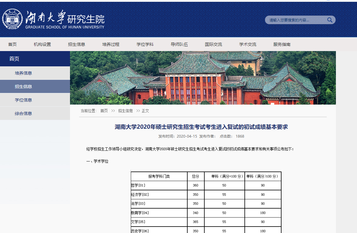 經(jīng)學(xué)校招生工作領(lǐng)導(dǎo)小組研究決定,湖南大學(xué)2020年碩士研究生招生考試考生進(jìn)入復(fù)試的初試成績(jī)基本要求和有關(guān)事項(xiàng)公布如下: