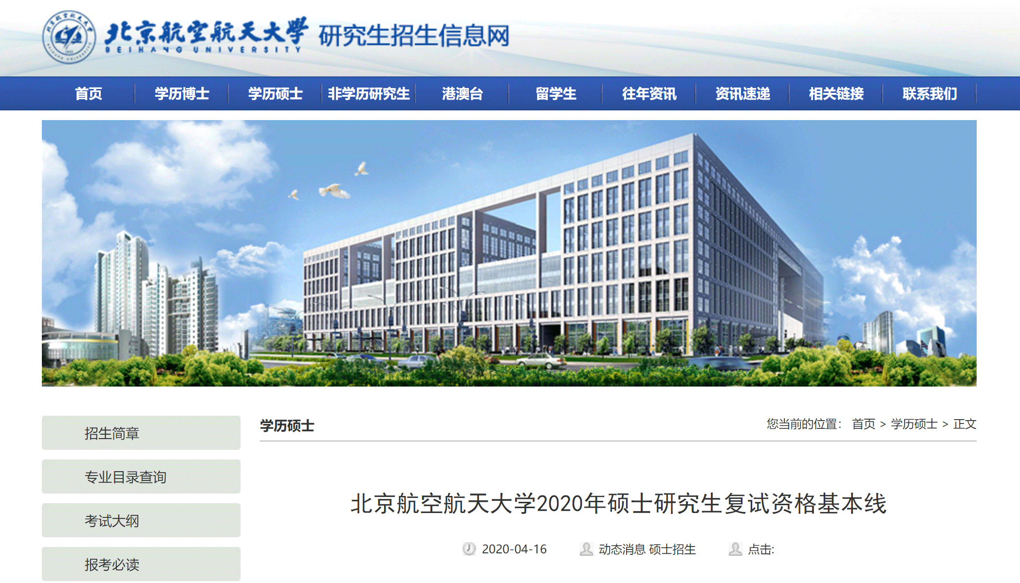 根據2020年我校碩士研究生初試成績統(tǒng)計結果和各學科專業(yè)擬招生計劃,經學校研究生招生工作領導小組討論決定,北京航空航天大學2020年碩士研究生復試資格基本線如下: