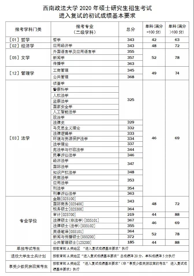繼2020考研國家線公布后,34所自主劃線院校也陸續(xù)公布2020年復試分數(shù)線,西南政法大學已經(jīng)公布2020年碩士研究生入學考試復試基本分數(shù)線,如下所示: