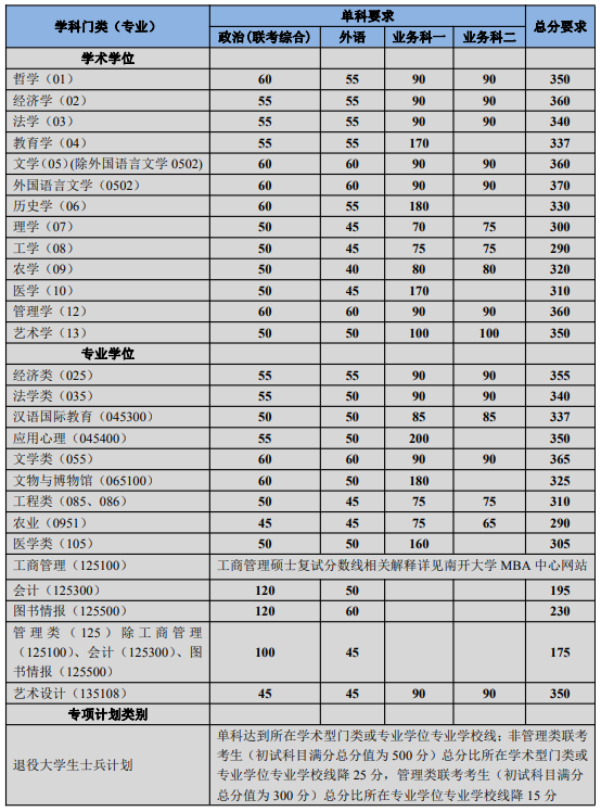 1、 以上進入復試的初試成績基本要求為我校統(tǒng)考、聯(lián)考生復試最低線。有關(guān)學院根據(jù)生源情況可在此基礎(chǔ)上上調(diào)部分或全部專業(yè)的單科或總分線,詳細情況請見南開大學研招網(wǎng)。