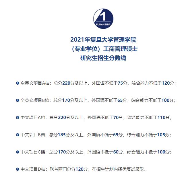 導讀:眾所周知,2021考研成績公布后,對于考研國家線及報考院校分數線也是非常期待的,其中34所自劃線院校復試分數線是考生關注和參考重點,按照往年規(guī)律,34所自劃線院校復試分數線公布時間要稍早于考研國家線。所以小編整理了“2021MBA34所自主劃線院校復試分數線:復旦大學MBA復試分數線_復試時間_國家線公布??!”的內容,各位考生了解一下~