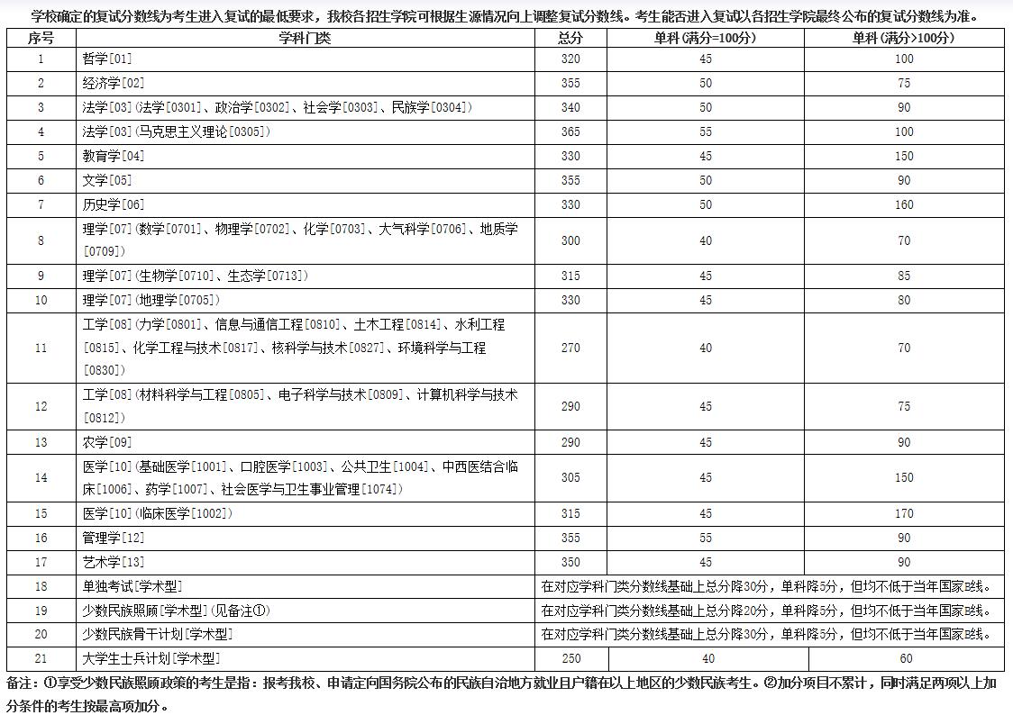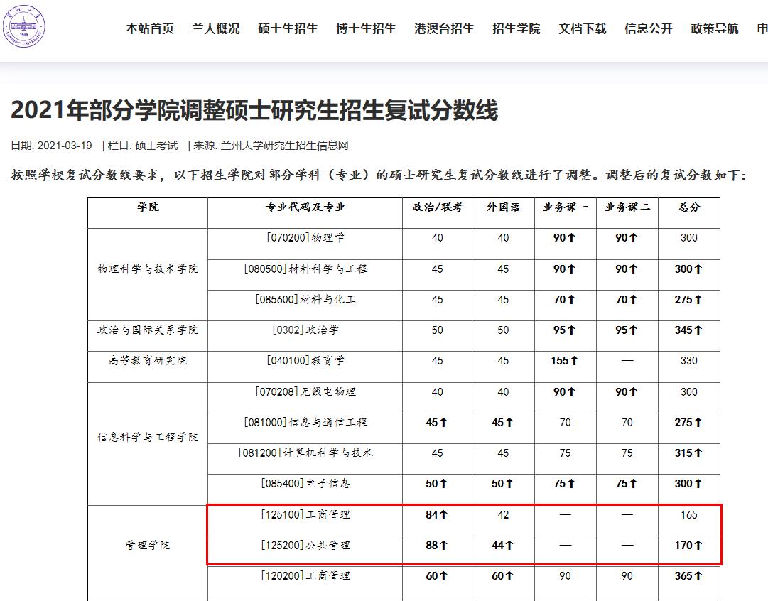 根據(jù)蘭州大學(xué)2021年碩士研究生招生考試復(fù)試分?jǐn)?shù)線的基本要求,管理類聯(lián)考各專業(yè)分?jǐn)?shù)線如下:工商管理[1251]165/84/42、公共管理[1252]170/88/44、會計[1253]235/145/70