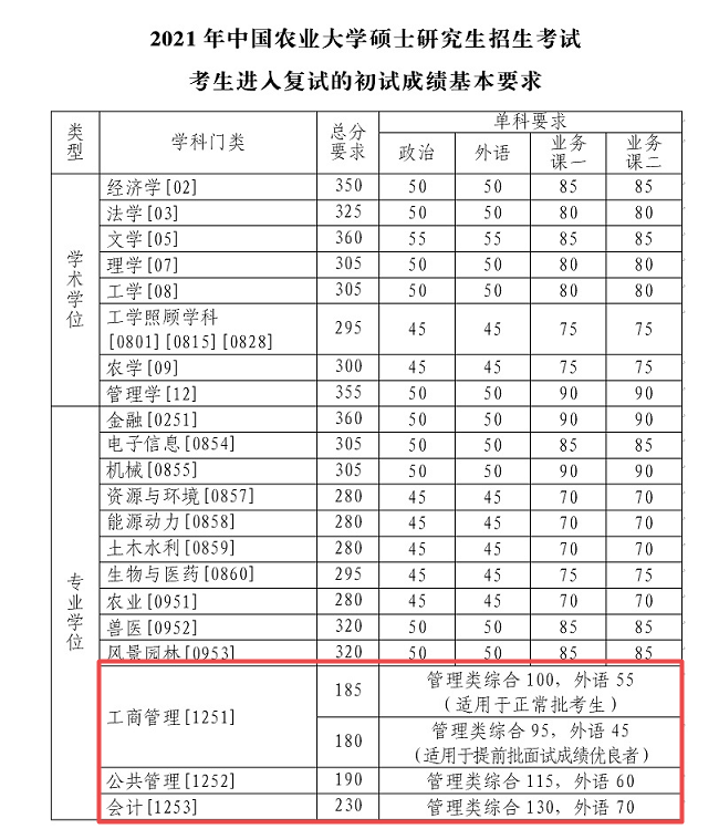 導(dǎo)讀:眾所周知,2021考研成績(jī)公布后,考研國(guó)家線、報(bào)考院校分?jǐn)?shù)線是考生關(guān)注重點(diǎn)。2021考研國(guó)家線已于3月12日公布,34所自主劃線院校復(fù)試分?jǐn)?shù)線也陸續(xù)公布。今天小編整理了“2021管理類(lèi)聯(lián)考(MBA MPA MEM MPAcc MLIS MAud MTA)34所自主劃線院校分?jǐn)?shù)線:中國(guó)農(nóng)業(yè)大學(xué)2021考研復(fù)試分?jǐn)?shù)線”的內(nèi)容,各位考生了解一下~
