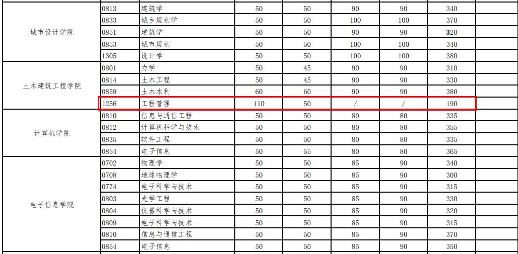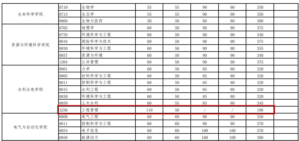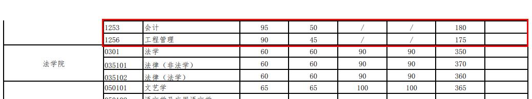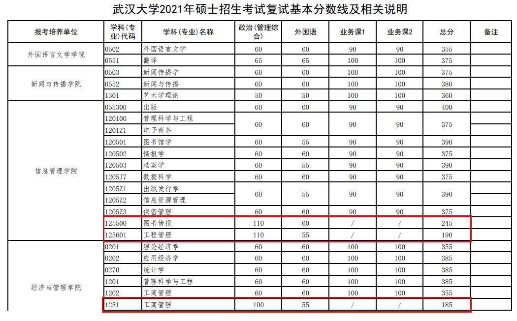 根據(jù)武漢大學(xué)2021年碩士研究生招生考試復(fù)試分數(shù)線的基本要求,管理類聯(lián)考各專業(yè)分數(shù)線如下:工商管理[1251]185/55/100、會計[1253]180/50/95、公共管理[1252]195/55/125、圖書情報[1255]245/60/110