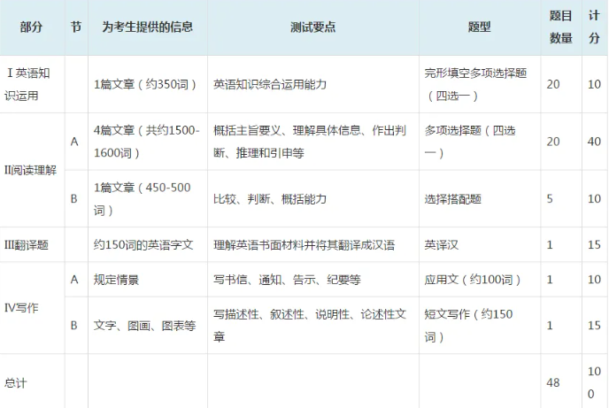 試題分四部分,包括英語知識運用、閱讀理解、翻譯和寫作,共48小題。