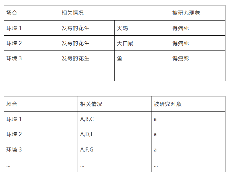 1960年,英國某農(nóng)場十萬只火雞和小鴨吃了發(fā)霉的花生,在幾個月內(nèi)得癌癥死了。后來,用這種花生喂羊、貓、鴿子等動物,又發(fā)生了同樣的結(jié)果。1963年,有人又用發(fā)了霉的花生喂大白鼠、魚和雪貂,也都紛紛得癌而死,上述各種動物患癌癥的前提條件中,對象、時間、環(huán)境都不同,唯一共同的因素就是吃了發(fā)霉的花生。于是,人們推斷:吃了發(fā)霉的花生可能是這些動物得癌死亡的原因。后來通過化驗證明,發(fā)霉的花生內(nèi)含黃曲霉素,黃曲霉素是致癌物質(zhì)。這就是“求同”。