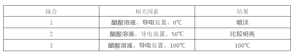 我們做個(gè)實(shí)驗(yàn)用0.01摩爾/升的醋酸溶液25亳升裝入燒杯,用測(cè)定溶液導(dǎo)電性的裝置檢測(cè)三種不同溫度下醋酸溶液導(dǎo)電性的強(qiáng)弱。