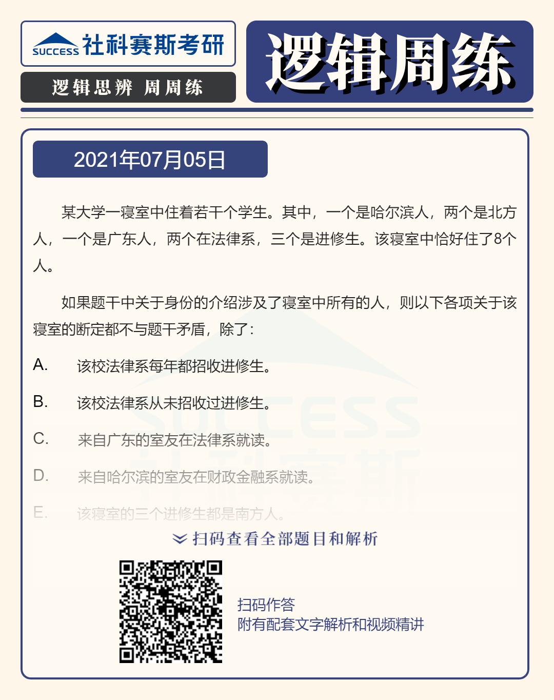 以上就是“2022MBA邏輯:2022MBA聯(lián)考邏輯習(xí)題及答案解析(7月5日)”的全部內(nèi)容,更多邏輯精選習(xí)題,請持續(xù)關(guān)注社科賽斯MBA備考網(wǎng)!