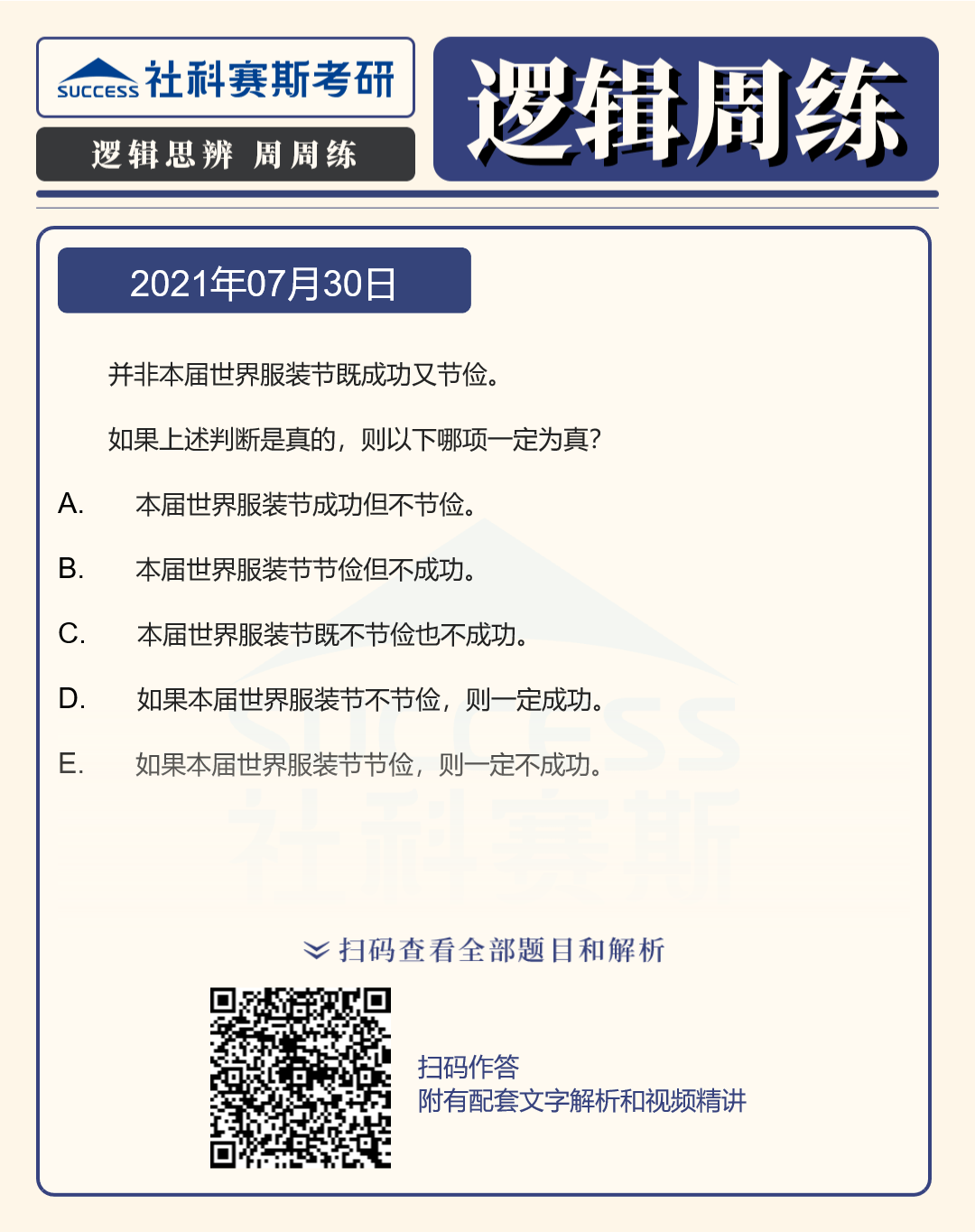 以上就是“2022MBA邏輯:2022MBA聯(lián)考邏輯習(xí)題及答案解析(7月30日)”的全部?jī)?nèi)容,更多邏輯精選習(xí)題,請(qǐng)持續(xù)關(guān)注社科賽斯MBA備考網(wǎng)!