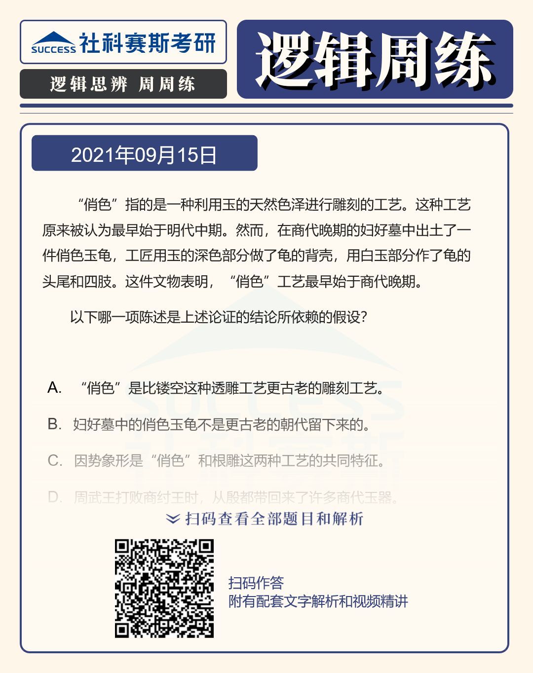 導(dǎo)讀:邏輯題型是管理類聯(lián)考考試中的必考題型,也是MBA聯(lián)考復(fù)習(xí)中的重要部分,社科賽斯MBA備考網(wǎng)小編整理了“2022MBA邏輯:2022MBA聯(lián)考邏輯習(xí)題及答案解析(9月15日)”的內(nèi)容,希望能對(duì)廣大考生有所幫助。