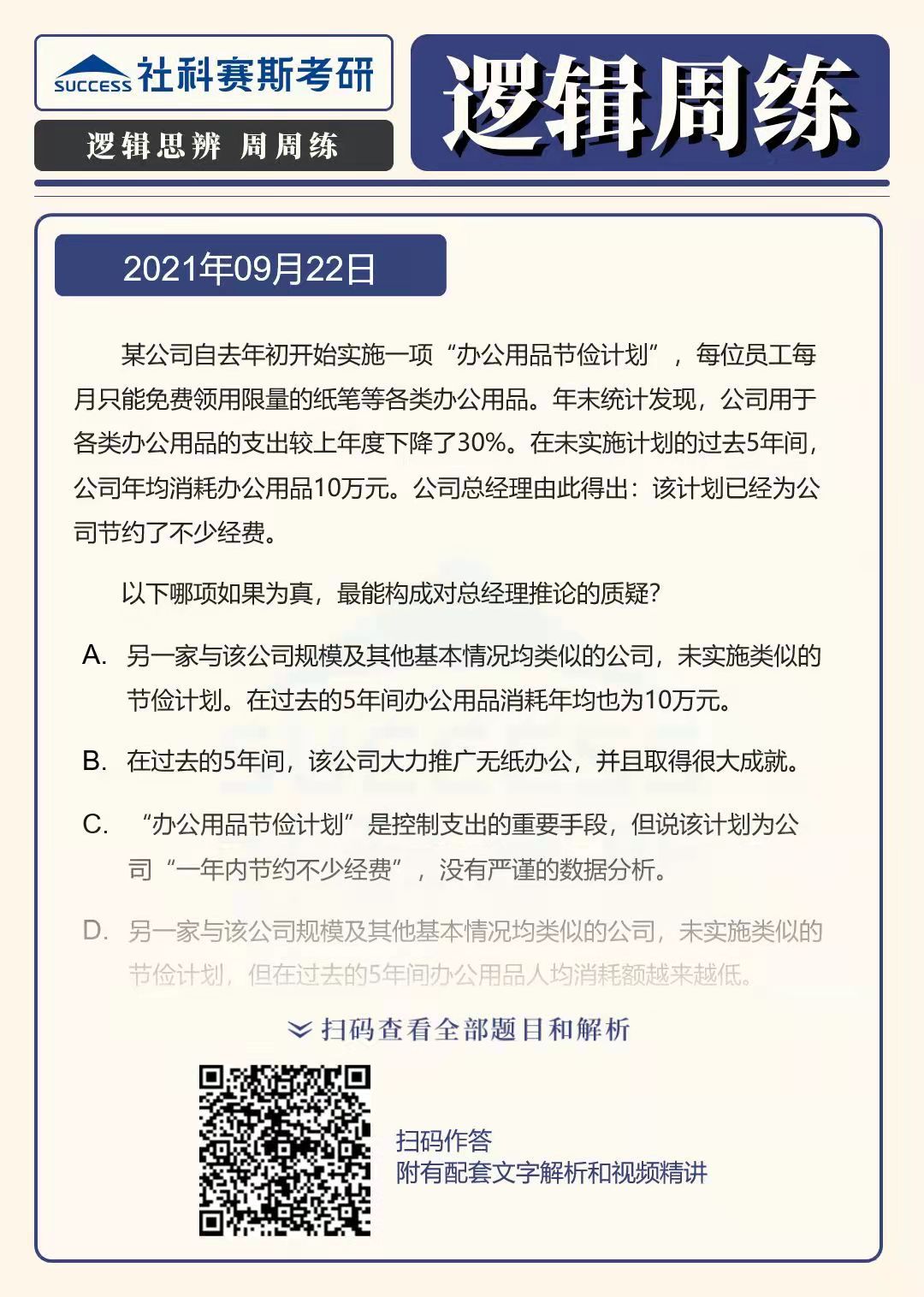 導(dǎo)讀:邏輯題型是管理類聯(lián)考考試中的必考題型,也是MBA聯(lián)考復(fù)習(xí)中的重要部分,社科賽斯MBA備考網(wǎng)小編整理了“2022MBA邏輯:2022MBA聯(lián)考邏輯習(xí)題及答案解析(9月22日)”的內(nèi)容,希望能對(duì)廣大考生有所幫助。