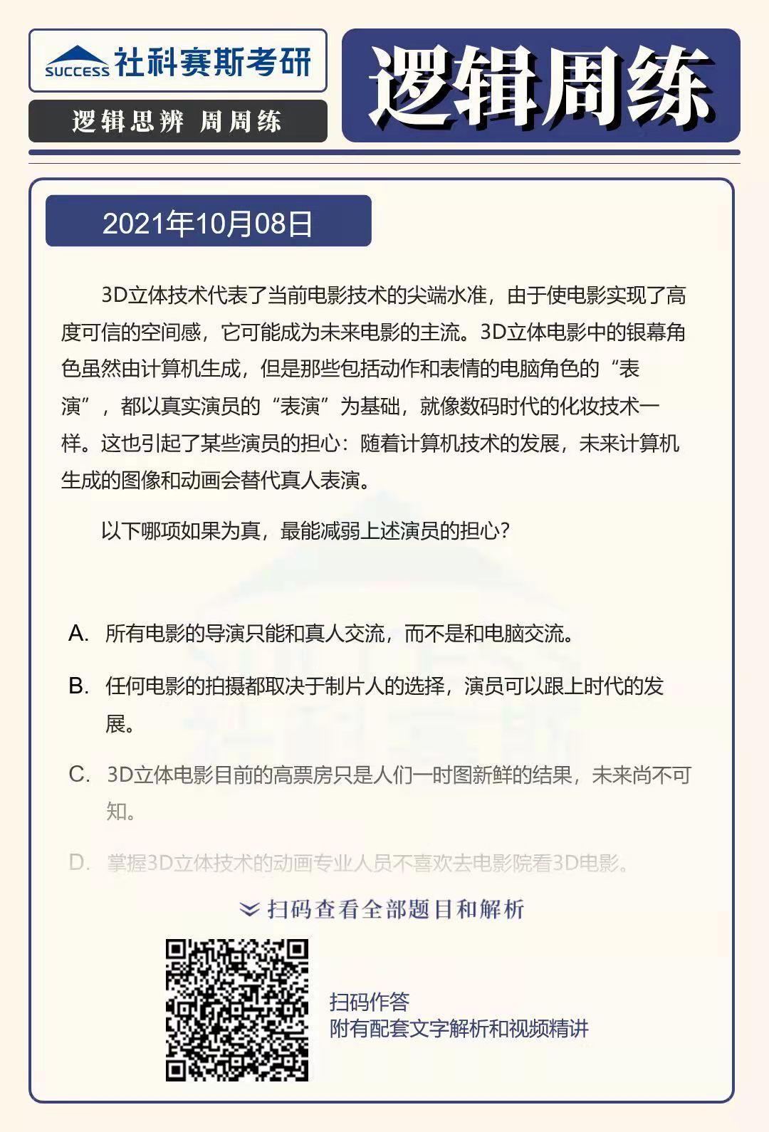 導(dǎo)讀:邏輯題型是管理類聯(lián)考考試中的必考題型,也是MBA聯(lián)考復(fù)習(xí)中的重要部分,社科賽斯MBA備考網(wǎng)小編整理了“2022MBA邏輯:2022MBA聯(lián)考邏輯習(xí)題及答案解析(10月8日)”的內(nèi)容,希望能對廣大考生有所幫助。