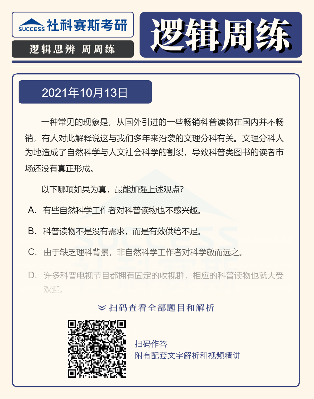 導(dǎo)讀:邏輯題型是管理類聯(lián)考考試中的必考題型,也是MBA聯(lián)考復(fù)習(xí)中的重要部分,社科賽斯MBA備考網(wǎng)小編整理了“2022MBA邏輯:2022MBA聯(lián)考邏輯習(xí)題及答案解析(10月13日)”的內(nèi)容,希望能對廣大考生有所幫助。