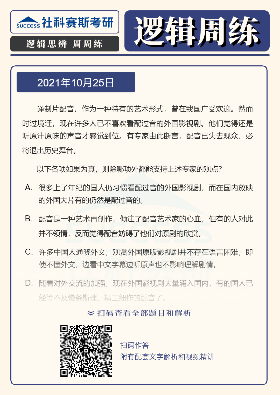 導讀:邏輯題型是管理類聯(lián)考考試中的必考題型,也是MBA聯(lián)考復習中的重要部分,社科賽斯MBA備考網(wǎng)小編整理了“2022MBA邏輯:2022MBA聯(lián)考邏輯習題及答案解析(10月25日)”的內(nèi)容,希望能對廣大考生有所幫助。