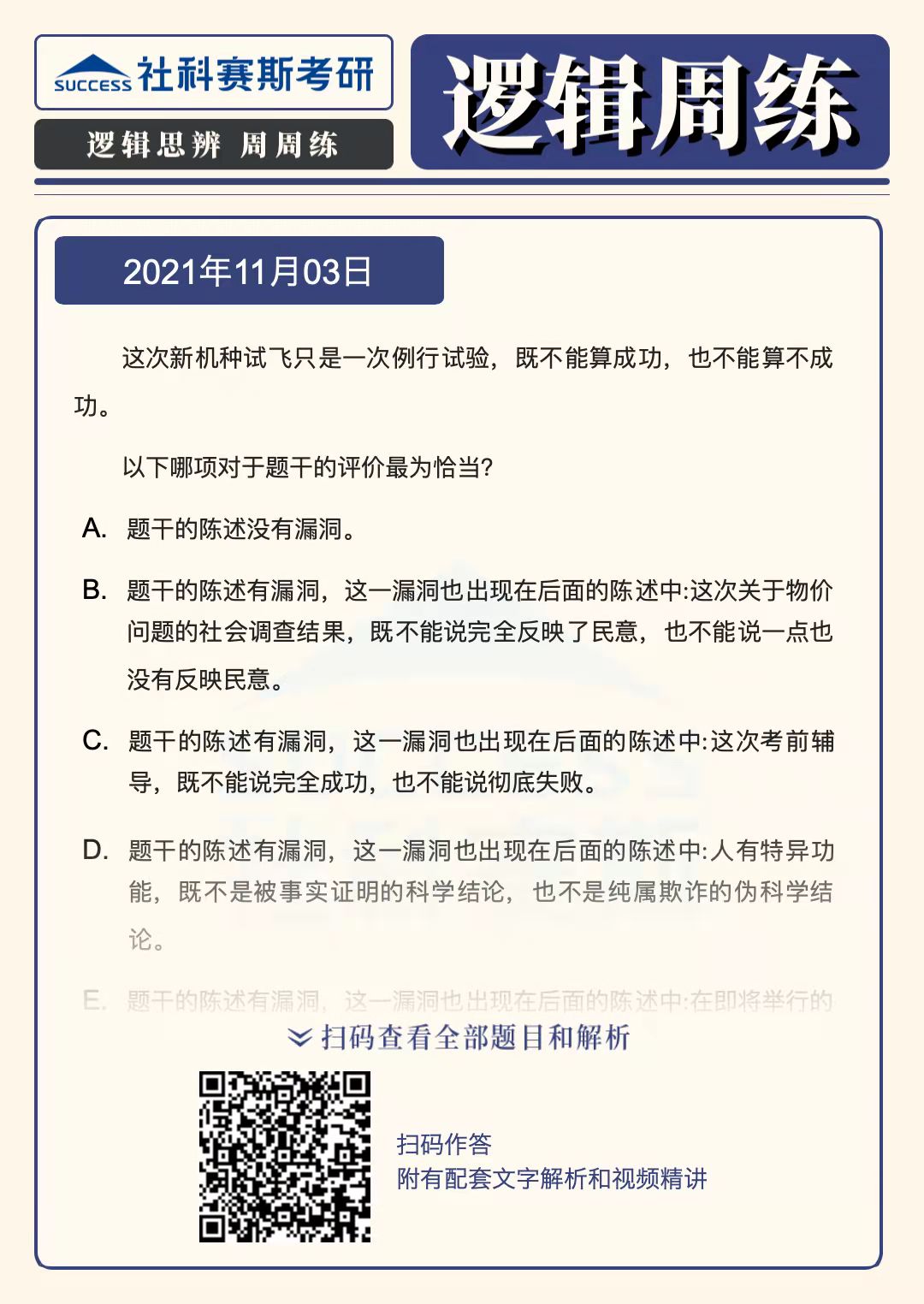 以上就是“2022MBA邏輯:2022MBA聯(lián)考邏輯習(xí)題及答案解析(11月3日)”的全部內(nèi)容,更多邏輯精選習(xí)題,請持續(xù)關(guān)注社科賽斯MBA備考網(wǎng)!