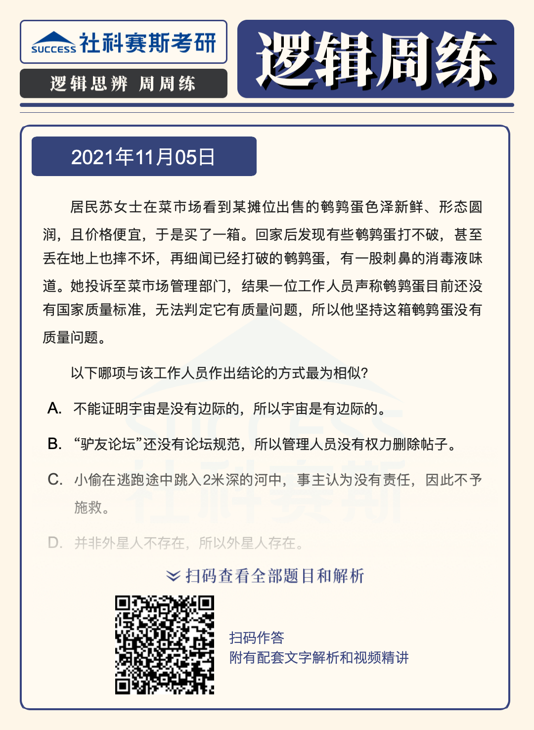以上就是“2022MBA邏輯:2022MBA聯(lián)考邏輯習(xí)題及答案解析(11月5日)”的全部?jī)?nèi)容,更多邏輯精選習(xí)題,請(qǐng)持續(xù)關(guān)注社科賽斯MBA備考網(wǎng)!
