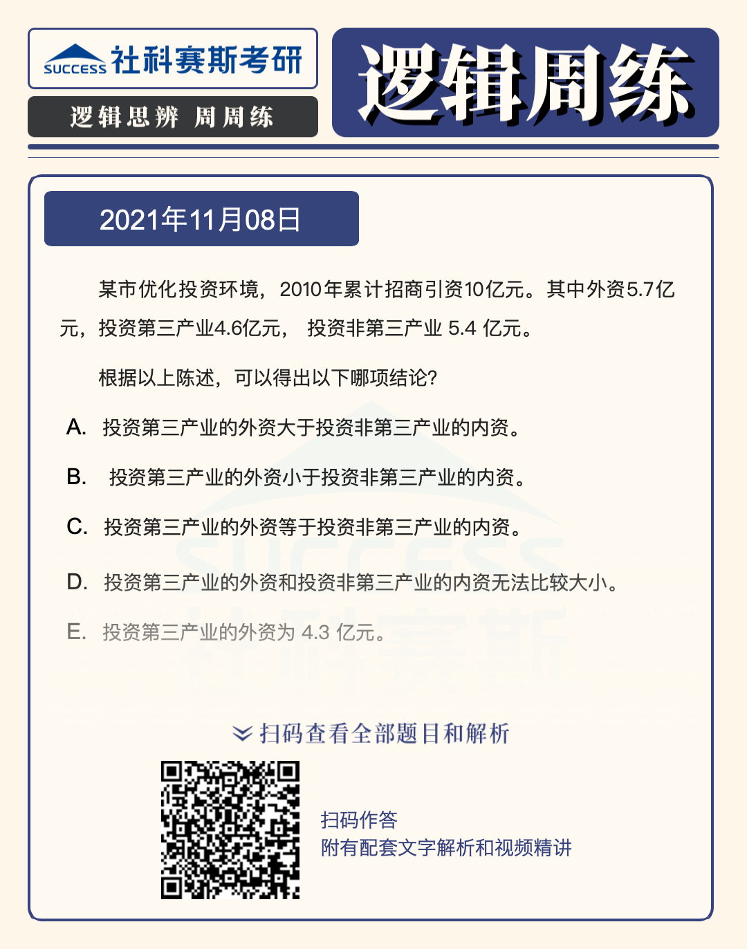 以上就是“2022MBA邏輯:2022MBA聯(lián)考邏輯習(xí)題及答案解析(11月8日)”的全部?jī)?nèi)容,更多邏輯精選習(xí)題,請(qǐng)持續(xù)關(guān)注社科賽斯MBA備考網(wǎng)!