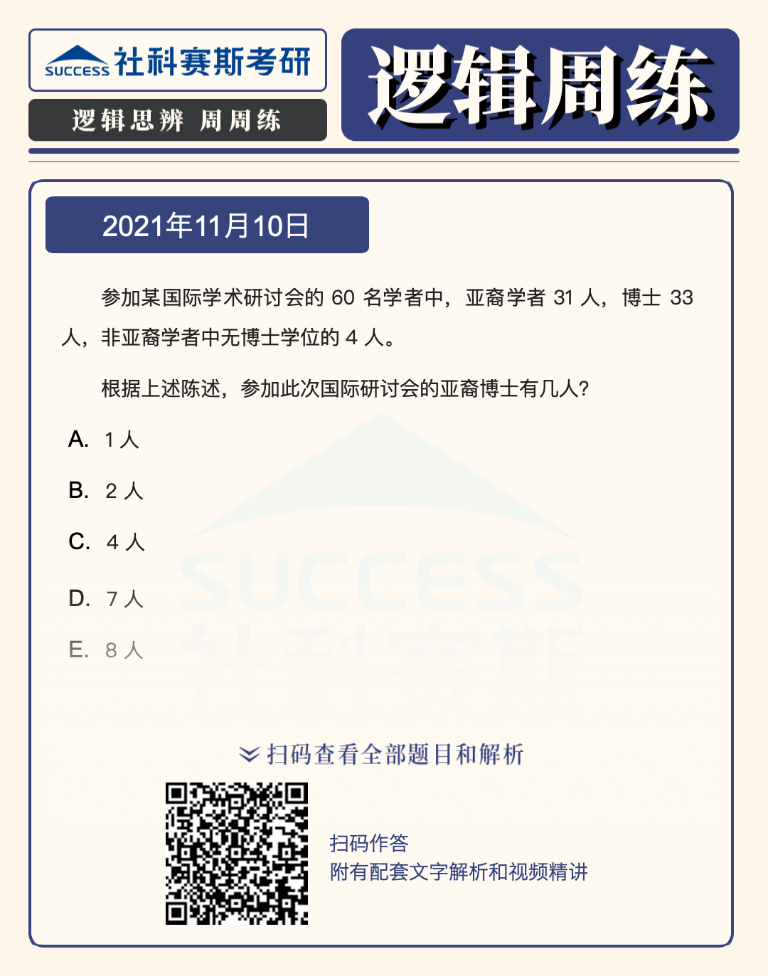 以上就是“2022MBA邏輯:2022MBA聯(lián)考邏輯習(xí)題及答案解析(11月10日)”的全部內(nèi)容,更多邏輯精選習(xí)題,請持續(xù)關(guān)注社科賽斯MBA備考網(wǎng)!