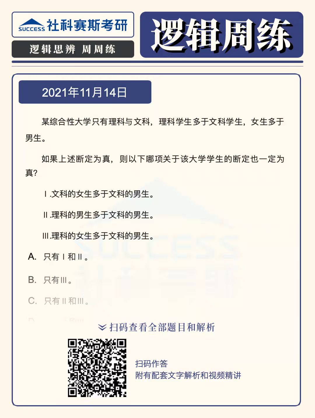導(dǎo)讀:邏輯題型是管理類聯(lián)考考試中的必考題型,也是MBA聯(lián)考復(fù)習(xí)中的重要部分,社科賽斯MBA備考網(wǎng)小編整理了“2022MBA邏輯:2022MBA聯(lián)考邏輯習(xí)題及答案解析(11月14日)”的內(nèi)容,希望能對廣大考生有所幫助。