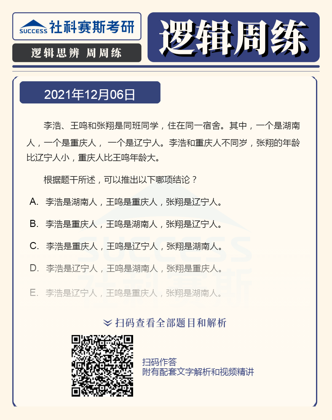 以上就是“2022MBA邏輯:2022MBA聯(lián)考邏輯習(xí)題及答案解析(12月6日)”的全部?jī)?nèi)容,更多邏輯精選習(xí)題,請(qǐng)持續(xù)關(guān)注社科賽斯MBA備考網(wǎng)!