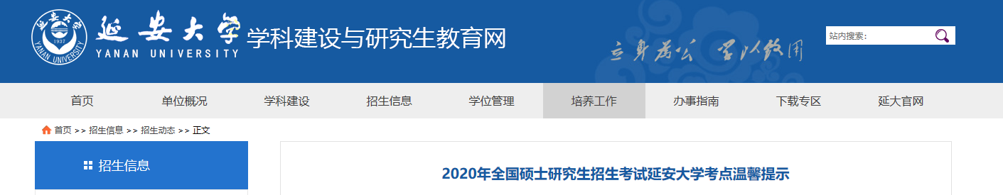 2020年全國碩士研究生招生考試將于2019年12月21日—12月23日進行,歡迎你在延安大學(xué)考點參加考試,延安大學(xué)碩士研究生招生考試工作領(lǐng)導(dǎo)小組溫馨提示如下: